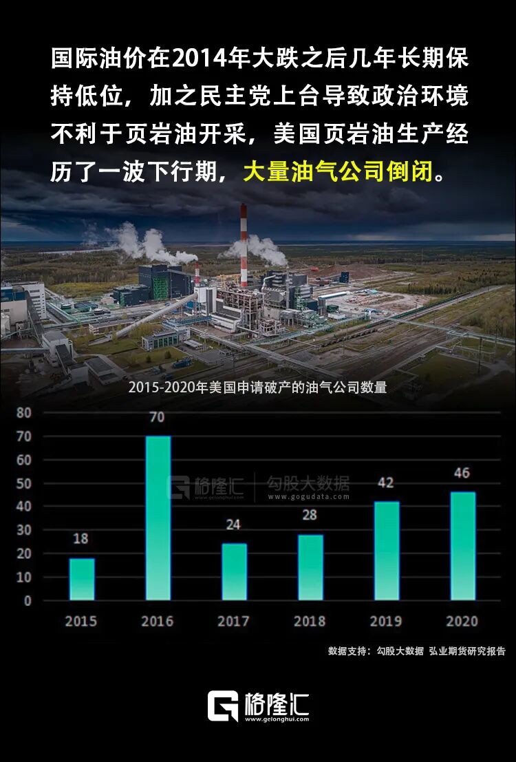 同时,在2014-2020年期间,国际油价长期保持低位,加之民主党上台导致政治环境不利于页岩油开采,美国页岩油生产经历了一波下行期,大量油气公司倒闭。