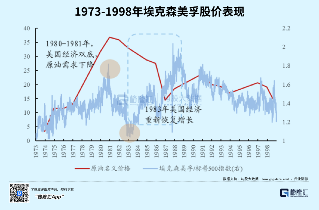 我们可以由此得出结论,在大滞胀时期,埃克森的股价先与油价同步,其后则与美国经济同步增长,即便油价下跌也不必然导致股价下跌。