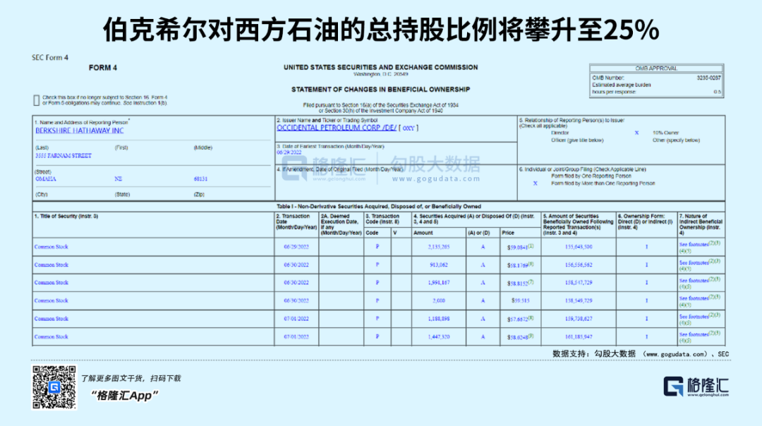 据此前SEC披露的文件显示,该公司分别在5月2日-3日、6月17日-22日大笔买入西方石油公司约590万股、955万股。