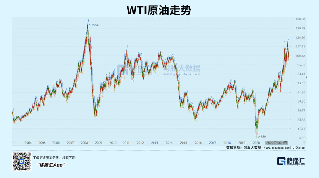 随后,在全球大放水的刺激下,加之最近几个月乌东危机升级为战争,布伦特原油从最低点15.98美元,一路上扬。从3月1日突破100美元至今,已在此位置上方盘旋长达4个月之久。