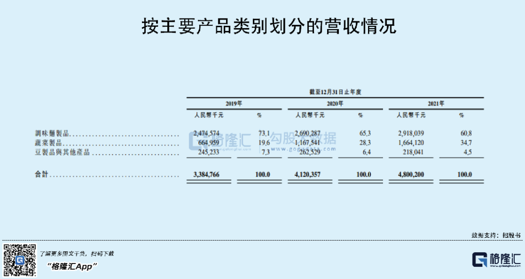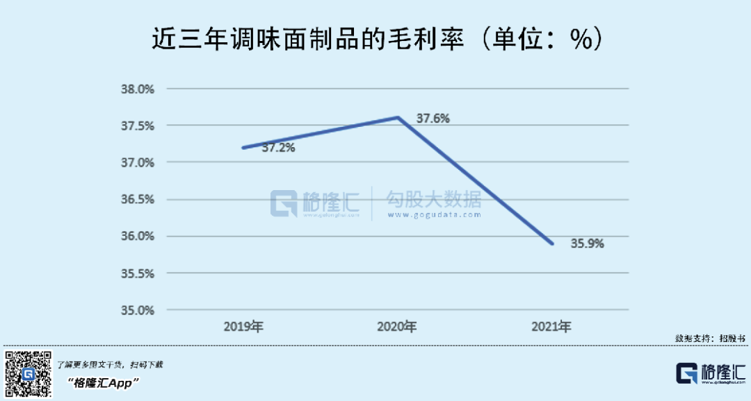 具体来看,目前公司旗下的产品主要包括调味面制品、蔬菜制品、豆制品等。其中,卫龙调味面制品即辣条,虽然占比在下降,但依旧是业绩“顶梁柱”,营收分别为24.75亿元、26.9亿元、29.18亿元。不过毛利率也明显下跌,而随着市场需求的增加,有关蔬菜制品的收入占比不断提升,但其存在感较低,整体而言,产品结构还是较为单一。