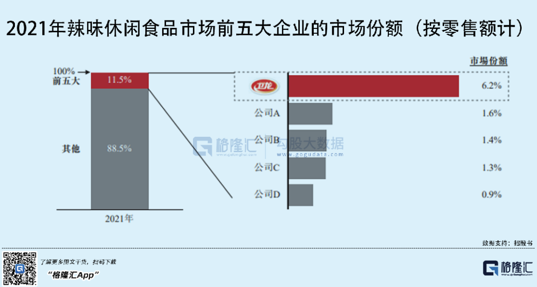如今,卫龙辣条已经走进了寻常百姓家,公开数据显示,按零售额计,2021年卫龙在中国所有辣味休闲食品企业中排名第一,市场份额达到6.2%(前五大企业的市场份额合计为11.5%)。