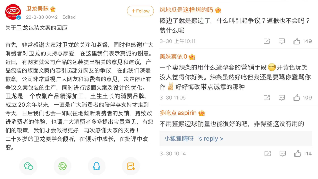 但是,俗话说得好,过犹不及,一旦没有把握好方向和尺度,便会引起消费者的反感,卫龙也曾翻过车,而这种不合适的营销显然会伤害品牌的口碑。