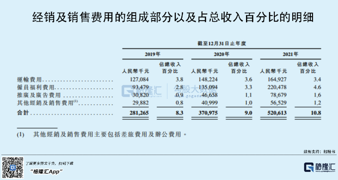 可以发现,卫龙的经销及销售费用也在不断增长,从2019年的2.81亿元增至2021年的5.21亿元,除去销售人员的奖金(作为绩效激励)上升,其中,推广及广告费用的增长不能忽视。