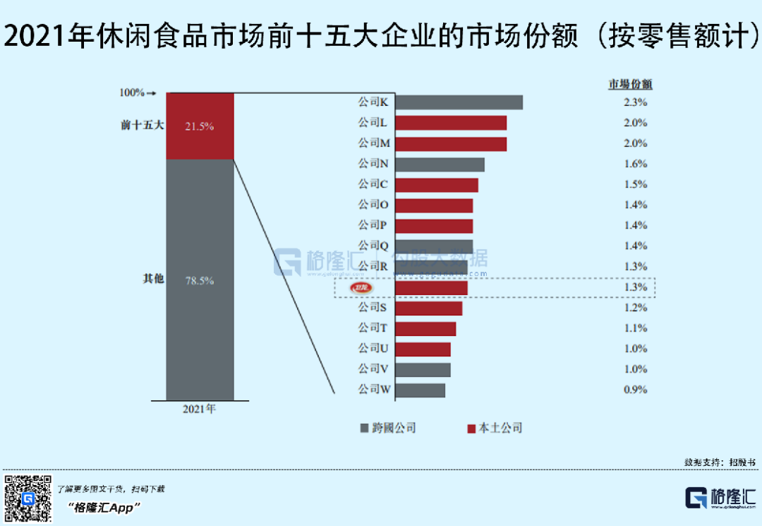 毕竟,零食具备高频消费属性,行业蓝海正在挖掘中,2026年中国休闲食品行业的市场规模预计将达到11472亿元,这一市场体量大,品类也五花八门,辣条也只是其中一个赛道。按零售额计,2021年在我国休闲食品市场,卫龙占整体市场份额的1.3%。