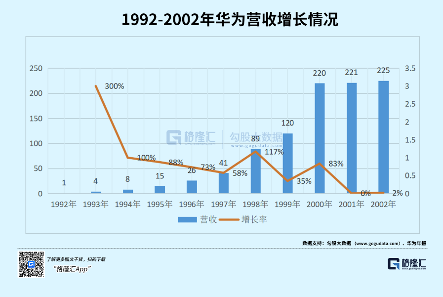果不其然,互联网泡沫导致全球通信建设需求大幅放缓,华为2001、2002年的营收接连陷入停滞。