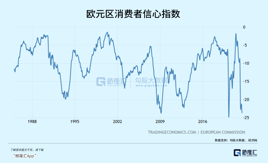 如此之高的通胀水平,将严重冲击经济表现。欧元区6月消费者信心指数已经跌至-23.6%,几乎与2008年金融危机、2020年新冠危机齐平。![]()