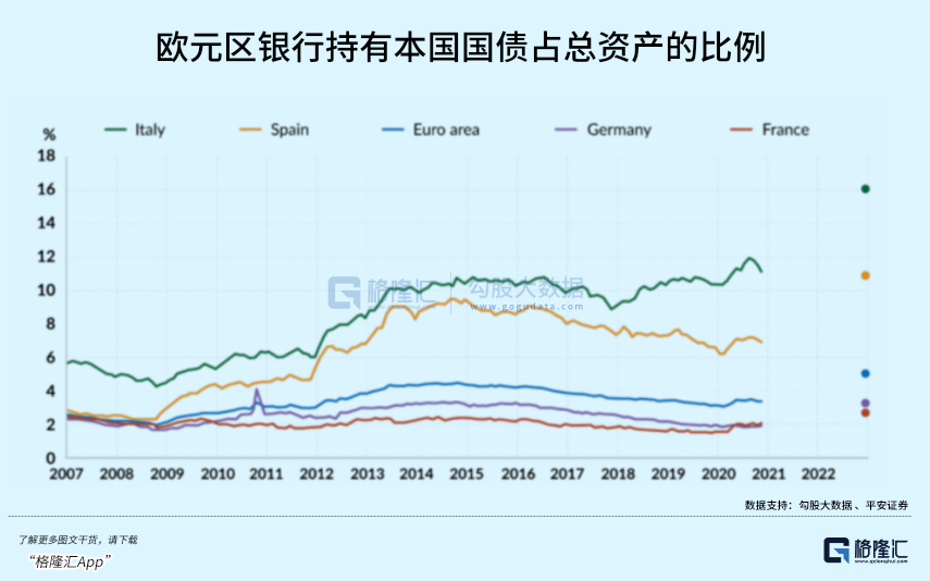 几个因素基本决定了欧洲爆发经济衰退,乃至危机或许只是时间问题。德国作为欧洲经济的火车头,已经提前预演了。5月,德国贸易逆差为10亿欧元。要知道,德国进口商品平均价格上涨31.7%,能源进口价格同比上涨157.4%,而出口商产品价格平均上涨15%。这是1991年以来首次发生贸易逆差。而在2021年之前,德国连续4年蝉联全球贸易冠军,在2021年被中国赶超位居第二,但贸易顺差额度仍然高达2610亿美元。外贸占德国经济比重的70%,远高于中国的34%、美国的20%以及日本的28%。5月贸易逆差,证明了德国经济出了问题。另外,法国3月贸易逆差为115亿欧元,创历史新高;英国4月贸易逆差为85亿英镑;意大利4月贸易逆差为36亿欧元,西班牙4月贸易逆差为64亿欧元。欧洲直面俄乌战争,经济衰退的风险很大。近日,英国央行警告银行业,应该为经济风暴做好准备,并将逆周期缓冲资本(CCyB)比率提高一倍至2%,以确保能渡过难关。一边加息收水,一边经济出问题,欧洲银行持有的大量金融资产将面临巨大的风险敞口。新冠疫情爆发之后,欧洲本土大型银行普遍加大了本国国债的持有比例。其中,意大利银行持有国债占总资产的比例一度回升至12%以上,创下历史新高。另外,欧洲银行普遍存在交叉持债现象。比如意大利的国债,被本国以外的欧洲商业银行以及金融机构持股20%左右。在2008年次贷危机以及2011年欧债危机之后,欧洲实施了极为宽松的货币环境,利率一降再降,甚至到了负利率,但欧元区经济总量几乎0增长。这决定了欧洲银行的信贷利润被大幅压缩。面对困境,欧洲大行加大了金融衍生品交易,去博取高额回报。这里面最典型的就是德意志银行。2015年,衍生品风险敞口高达2150亿欧元,而净公允价值仅为183亿欧元,前者是后者的12倍。到了2019年一季度末,这一风险敞口达到了3310亿欧元,是其净价值的15.8倍。2020年爆发新冠疫情之后,欧洲央行更是水漫金山。资产负债表从2008年的1.3万亿欧元急速扩张至当前的8.8万亿欧元,膨胀了5.77倍,基准利率从4%下降至0。长期超低利率之下,均有利于各类金融资产的膨胀,包括国债以及金融衍生品。但通胀彻底改变了游戏规则,逼迫欧央行收水加息。那么,欧洲银行此前大量持有的主权债券以及金融衍生品的风险大增。银行巨头超跌这么多,反过来暗示经济衰退危机、以及金融市场动荡的风险愈来愈大。1999年1月1日,欧盟开始实施单一货币欧元和统一的货币政策。面对欧元的巨大威胁,美国在里面埋了不少大雷。华尔街投行高盛通过做假账,把并不符合欧元区要求的希腊抬了进去。以同样手法,高盛在西班牙和意大利上通过粉饰账目,把两者也送进了欧元区。欧元区成立之后,成员国的融资成本大幅下降,尤其是希腊、爱尔兰、西班牙、意大利等主权信用较低的国家。发债成本的大幅下降促进了欧元区经济的持续繁荣,但也留下了巨大隐患。一方面,德法为首的经济强国的银行大量借债给外围国家,催生了资产泡沫。另一方面,希腊为首的成员国违反《马约》,扩大财政赤字水平,占GDP的比例在2007年已经提升至6.5%。要知道,财政政策都捏在成员国自己手里,且违反规则几乎没有什么实质性惩罚。欧元区一切安好,一直到2008年美国爆发次贷危机。不巧的是,欧洲银行是美国次级债券最大的债主,因此遭受了巨大的冲击和系统性崩溃的风险。为了救欧洲银行,欧元区成员国纷纷向本国银行系统注入大量资金维系金融稳定,将银行的次贷毒资产、垃圾资产转移到政府债务之下,从而大幅提升了政府债务水平。据统计,欧元区政府债务占GDP的比例从2008年的69.7%飙升至2009年的80.2%,并在未来数年持续飙升。次贷危机之后,欧元区经济遭受重创,深陷泥潭。在这个时候,美国开始谋划精准狙击欧元,捍卫美元霸权。要知道,欧元一诞生,就可与美元分庭抗礼,是后者最大隐患和威胁。2009年,高盛联合两家大型对冲基金通过购买信用违约互换保险的方式专门针对希腊展开了金融攻击。与之配合的是,美国三大评级机构几乎同时把希腊的主权评级大幅下调(惠普、普尔从A-至BBB+)。没过多久,三大评级巨头又对西班牙、爱尔兰、葡萄牙等国进行主权信用降级,导致债务危机逐步蔓延开来。高盛领携的国际投行大势做空希腊、爱尔兰、西班牙、葡萄牙和意大利的CDS头寸(信用违约互换),赚取巨额利润。另外,相关主权国的CDS价格飙升,严重打击市场信心。与此同时,资本大举做空欧元汇率,从2009年末到2010年3月巨贬10%左右。欧元区外围债务违约势头如星星之火燎原开来,开始向核心经济强国蔓延。尤其是意大利和西班牙作为欧洲第三、第四大经济体,如果一旦出现债务违约,将对市场的冲击非常之大。随着后两国危机的逼近,法国也开始面临债务违约风险。当时,市场也有迹象在做空法国主权债券,危机步步逼近。第一个大招是大幅降息。欧元区利率从2011年11月的1.5%快速降低至2013年的0.25%,降息幅度高达125个基点。第二,紧急QE印钱,进行资产购买。2010年5月至2012年9月,欧央行直接从二级市场购买希腊、爱尔兰、葡萄牙等主权违约风险较高的政府和企业债券,以压低债券利率。第三,引导市场预期。欧洲央行在2012年9月宣布OMT计划,承诺央行可以无限量购买符合条件成员国的短期政府债券。这一点类似2020年3月美联储的无底线QE计划。三招之后,欧洲债务危机得以缓解。但欧元汇率持续疲弱,开