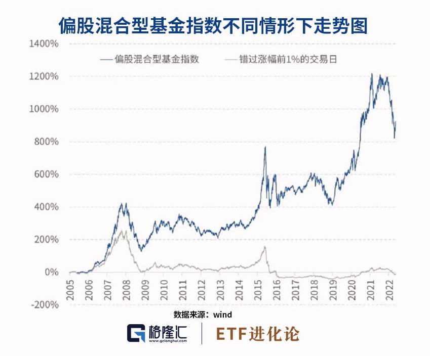 以偏股混合型基金指数为例,2005年至今累计涨幅1166%,但若错失前1%的交易日,收益为140%,减少近90%。股市大部分收益是在小部分的时间里赚到的。有时看似无效的时间,则是确保机会来临时能在场。