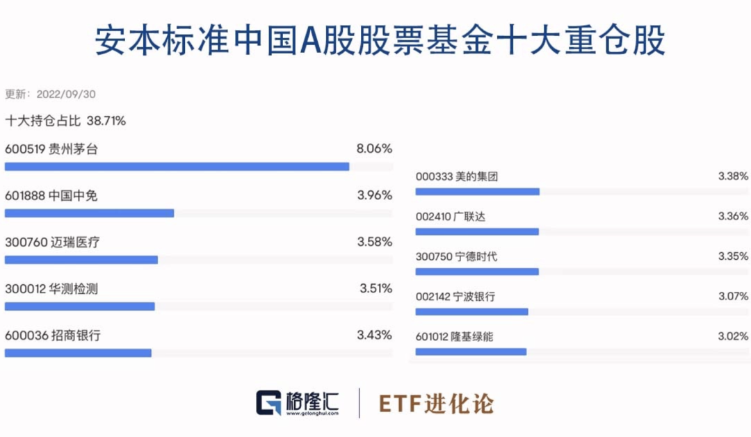 截至9月末,安本标准中国A股股票基金前十大重仓股分别为贵州茅台、中国中免、迈瑞医疗、华测检测、招商银行、美的集团、广联达、宁德时代、宁波银行、隆基绿能,前十大重仓股合计持仓占比38.71%。