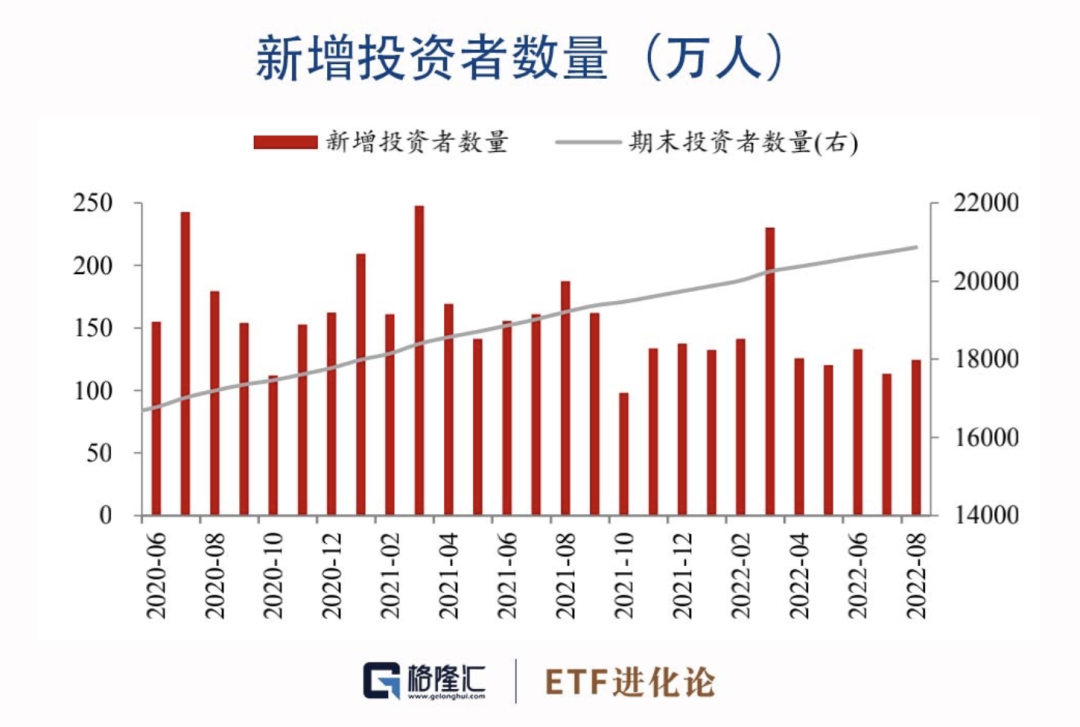 2022年8月份新增投资者125万人,截至2022年8月底,投资者数量为2.09亿人。在2020年6月开始市场行情好转,新增投资者数量在2020年7月达到阶段性高点,之后则是连续下降。