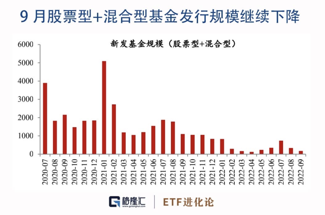 9月份以来,基金发行规模继续下降。9月新发基金中,股票型+混合型规模为175亿元,其中混合型基金发127亿元,股票型基金发行48亿元,环比下降160亿元。
