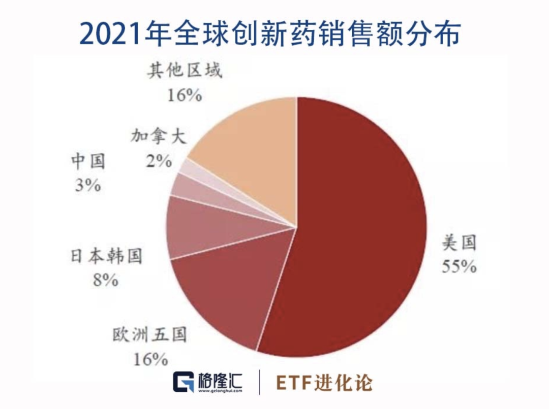 全球创新药市场大,而国内创新药目前占比依然较低。2021年全球创新药销售额共计8300亿美元,其中美国创新药销售额占比达55%,欧洲五国占比次之为16%,中国占比仅为3%。
