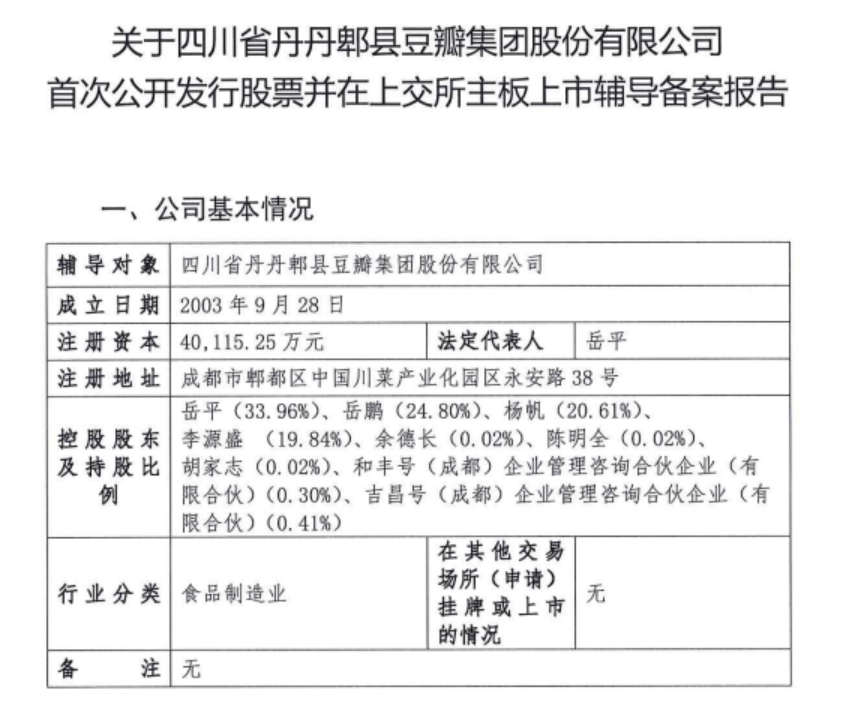 此前,四川省丹丹郫县豆瓣集团股份有限公司(以下简称“丹丹豆瓣”)披露了首次公开发行股票并在上交所主板上市辅导备案报告,辅导机构为招商证券。