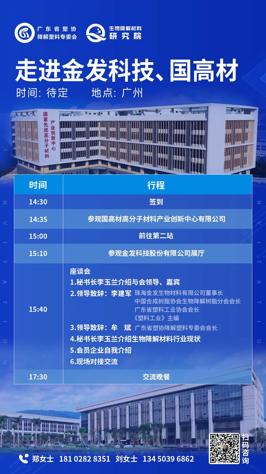 为促进生物降解材料上下游企业资源共享、抱团发展,同时发挥科研院所的引领带动作用,加快高分子材料领域技术成果的转化,生物降解材料研究院带领广东省塑协降解专委会会员一起走进金发科技、国高材,现将相关事项通知如下: