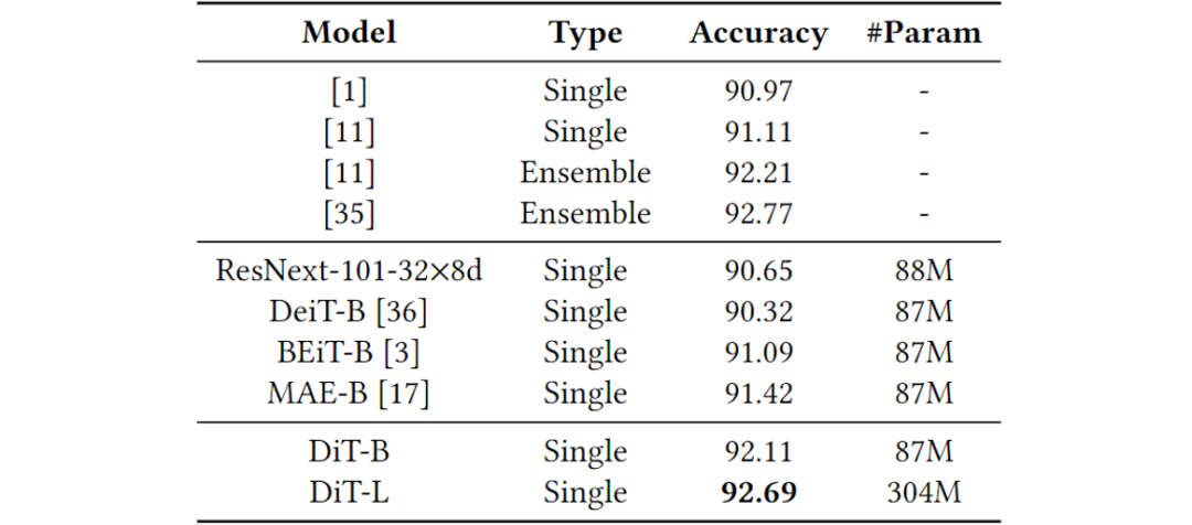 Table 1. Document Image Classification accuracy (%) on RVL-CDIP, where all the models use the pure image information(w/o text information) with the 224×224 resolution.