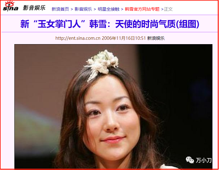 2001年,“玉女掌门人”张柏芝,在拍《浪漫樱花》时,发现同剧组的女二派头很大,开工收工有专车接送,还有貌似警卫员的壮汉在片场守护。不仅张柏芝,导演组也很震撼,这阵势,令人想入非非……这位在张柏芝与郭富城主演的电影《浪漫樱花》中,饰演女二的,是18岁的韩雪,正在苏州念高三,第一次拍电影。她6岁唱歌,屡次获奖,还在12岁那年作为苏州唯一的“红领巾代表”,赴京参加全国少先队代表大会,受到国家领导人接见,成为大人口中“别人家的孩子”。当别人家的孩子,还在为吃顿好饭发愁时,4岁的韩雪已经坐上了飞机。她显赫的家庭背景,和同龄人的差距,不是一般的大。关于她讳莫如深的家族背景,网上流传多个版本,广为流传的是,说她家族多人在部队担任要职,外公是开国将军、《亮剑》中“李云龙”的原型王近山中将……生于苏州的苗族姑娘韩雪,小时候就唱歌不错,英语也很出色,家人给她的规划是做一名翻译或外交官,偏偏她对当明星这事很执着。所谓出名要趁早,最好来个一鸣惊人,于是就有了一场噱头十足的“造星运动”。2000年,香港嘉禾影视公司,在上海举办了一场“世纪之星”影视歌新人大赛。17岁的韩雪在这次大赛中,一鸣惊人,斩获全国金奖。这时的网媒正在兴起,关于比赛的一些“内幕”就此在网上传开了。记者用“大爆冷门”来形容韩雪夺冠,一些热门选手为此心里失衡,极度不满。因为17岁的韩雪,除了打扮像章子怡,表现并无突出之处。赛后,韩雪签约嘉禾,主演了电影《浪漫樱花》、电视剧《南北一家亲》,重要的是,这些戏,都是与名导名角合作的。家里人怕她年龄小被欺负,第一次拍电影时,还派了专车和身着制服的司机,为她保驾护航,让同剧组的张柏芝大吃了一惊。回首看那场“世纪之星”选秀大赛,像是专门为韩雪量身订制的,好让她出道时师出有名,光环加持,拍个主角也顺理成章。至于亚军和季军,江湖上连个名字都没有听过……不过,韩雪坚称自己夺冠是因为运气好,当年参赛也是瞒着家里人报名的。不管怎样,还在念高三的韩雪,已经比那些科班毕业,通过龙套熬出头,甚至靠潜规则上位的女星们,幸福很多,也洁白很多。2001年,18岁的韩雪考入上戏,与胡歌、袁弘成为同班同学。不久,不愉快的事就发生了。韩雪踏入上戏校园时,就和同学们不一样。她是文化考试第一名的佼佼者,是第一个带经纪合约的新生,更是胡歌眼中的“白富美”,动不动就请客吃饭。当时上戏明文规定,在校学生从大三起,才允许拍戏。而韩雪一进校就开始接戏,显然违反规定。老师也不是不讲情面,表示她可以一年拍一部戏,多了就不行。可这个“后门”太窄,韩雪走着走着就不爽了,一年一部戏哪够啊。于是一部之后,又一部,还和新索音乐签了唱片约,录起了唱片……这就闹得很不愉快了,韩雪看着校方的脸色越来越黑,极度不适,自己退学了。也不晓得韩家人是怎么回事,没有摆平这个局。或许是深知这么明目张胆地撬动规则,是会遭反噬的。从这件事上,可以看出韩雪对娱乐圈,是如饥似渴的真爱。2003年,韩雪主演了爱情剧《愤怒的蝴蝶》、武侠剧《飞刀又见飞刀》,还在电影《长恨歌》中一人分饰两角,还发了新曲《想起》,又唱了多首片头片尾曲……20岁的韩雪,荣获第一届金南方年度最具魅力女演员奖,一时被誉为“走势最看好的影视歌全能新人”。2004年的韩雪继续开挂,主演了热播剧《江山美人》《萍踪侠影》《福星高照猪八戒》,发行了传唱度很高的音乐专辑《飘雪》。这一年,21岁的韩雪,凭《飘雪》获得“东方风云榜年度最佳新人”,被幕后团队打造成“新玉女掌门人”。韩雪心满意得,觉得自己还可以再厉害一点。偏偏这时,噩耗传来了。2004年,韩雪爷爷因病逝世。这时大家才发现,原来所谓的大人物并非韩雪外公,而是韩雪的爷爷。2005年,韩雪主演的苦情戏《错爱一生》登上CCTV8,成为爆款,刷新了CCTV黄金档电视剧的收视纪录。这一年,她还获了两个奖项,一个是“第十二届东方风云榜东方新人银奖”,另一个是“第二届金南方年度最具魅力女演员奖”。一个歌手奖,一个演员奖,比演戏的唱得好,比唱歌的演得好,两手都很硬,就是要你服气。2007年1月,韩雪获得第三届新浪网络盛典“年度飞跃艺人奖”,这个时候的新浪,正被“阳光四通”控股,而“阳光四通”是“前央视一姐”杨澜和老公吴征牵头成立的。“阳光四通”还有一位合资者,是夫妇俩的共同好友万山,他曾在阳光卫视担任总经理,后出任阳光四通新媒体投资有限公司总裁一职。此时的韩雪,正与大她18岁的万山,发生着千丝万缕的关系。2007年2月,韩雪以歌手身份,首度登上春晚舞台,独唱了歌曲《竹林风》。想想两年前,号称“英皇一姐”的容祖儿想上春晚,还得托成龙的“促销”手段。这首《竹林风》还获得第14届东方风云榜十大金曲奖,这一届,东方风云榜首次启用网络票选,投票渠道正是新浪。3月,韩雪首次登上福布斯中国名人榜,名列第83位。年底,她主演的历史感情剧《北平往事》再上央视8套。这一年,韩雪24岁,360度的优秀,再努把力就是一线女星了。于是,她开始突破自我,演了很多跨题材的电视剧。虽然并没有攒下观众缘,但这不能阻止她前行的魔幻步伐。2008年,韩雪的新歌《大雁归》,再获“东方风云榜十大金曲奖”,新剧《爱情占线》,则令她获得“新浪电视剧评选最佳女演员”