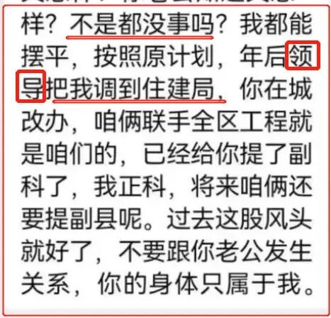 总之,如今手握“大权”的郭某某之所以这么嚣张,大概是因为背后有人!他短信里已经提供了线索:“年后领导把我调到住建局,你在城改办,咱俩联手,全区工程就是咱们的,已经给你提了副科了,我正科,将来咱俩还要提副县呢。”首先,暴露了郭主任背后有人,即便是“偷情”事件搞得风声鹤唳,这位领导也能按原计划把他调到住建局,可见能量不小!