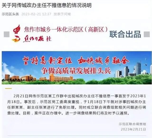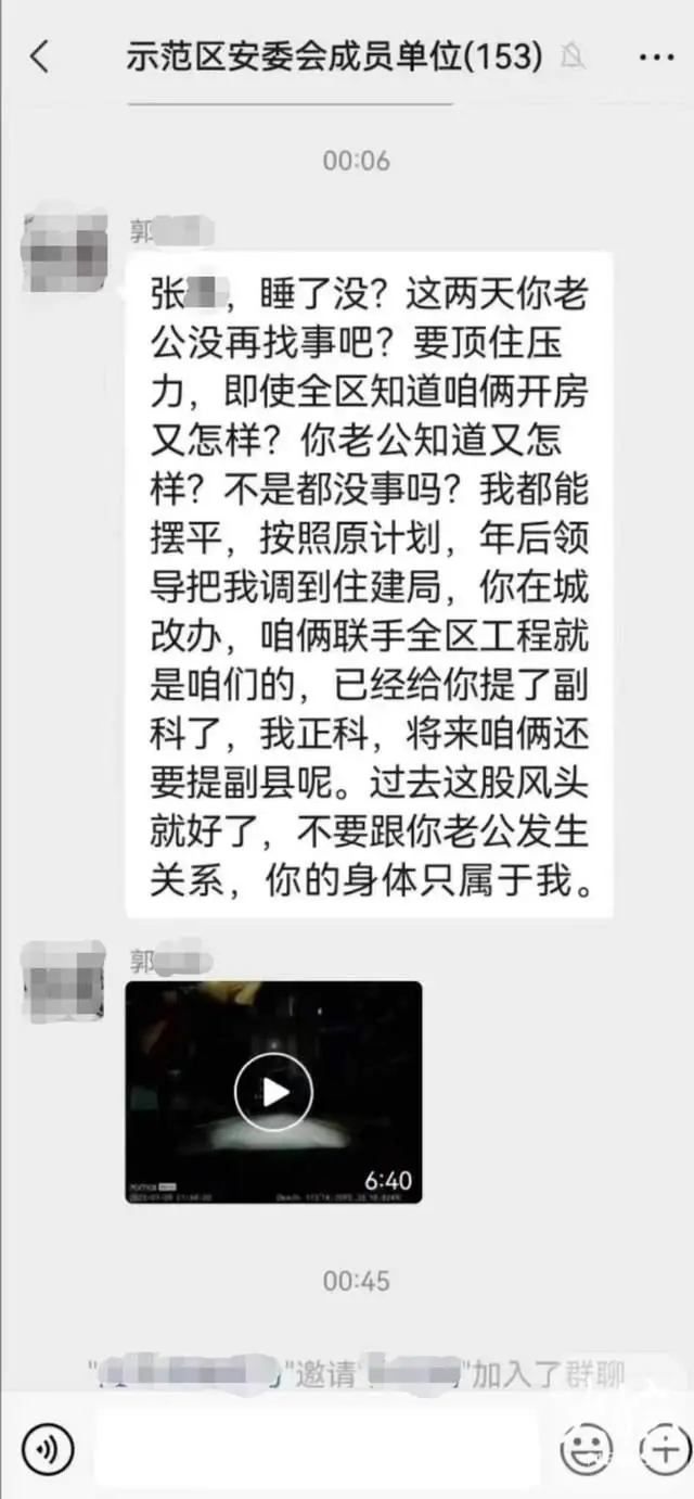 “即使全区知道咱俩开房又怎样?不是都没事吗?我都能摆平。”这是河南省焦作市城乡一体化示范区城改办主任郭某某,在工作群发的不雅信息。据媒体报道,男女主角郭某某为该区城改办主任,女主角张某为城改办副主任。从短信内容可以看出,两人疑似存在不正当关系,对方的丈夫可能知道两人开房的事,又在闹事。“再”的言外之意是,之前找过事,现在又找事,这就叫“再”,由此推断女方老公可能已经知道两位干部的“奸情”,并在维权。作为一个干部,和有夫之妇偷情,与女下属有染,本身就是严重的作风问题,“东窗事发”后,不仅不收敛、不收手,反而给女炮友加油鼓劲,叫嚣:“要顶住压力,即使全区知道咱俩开房又怎样?不是都没事吗?我都能摆平。”这么嚣张的“奸夫”,估计西门大官人泉下有知都会感到自愧不如,可谓前无古人了,至于以后有没有来者,就不好说了。当然,更牛的还是最后一句话:不要和你老公发生关系,你的身体只属于我!鸠占鹊巢,偷人老婆还不够,纵欲无度的郭主任竟然还怂恿对方不要和自己的老公发生关系,试图彻底将对方的身体占为己有,让女下属成为自己的“专供”“特供”!这“好色”的欲望到登峰造极的境界了,可谓年度最牛开放干部了!从未见过如此无耻之人,用“无耻”来形容他,简直玷污了“无耻”这个词!