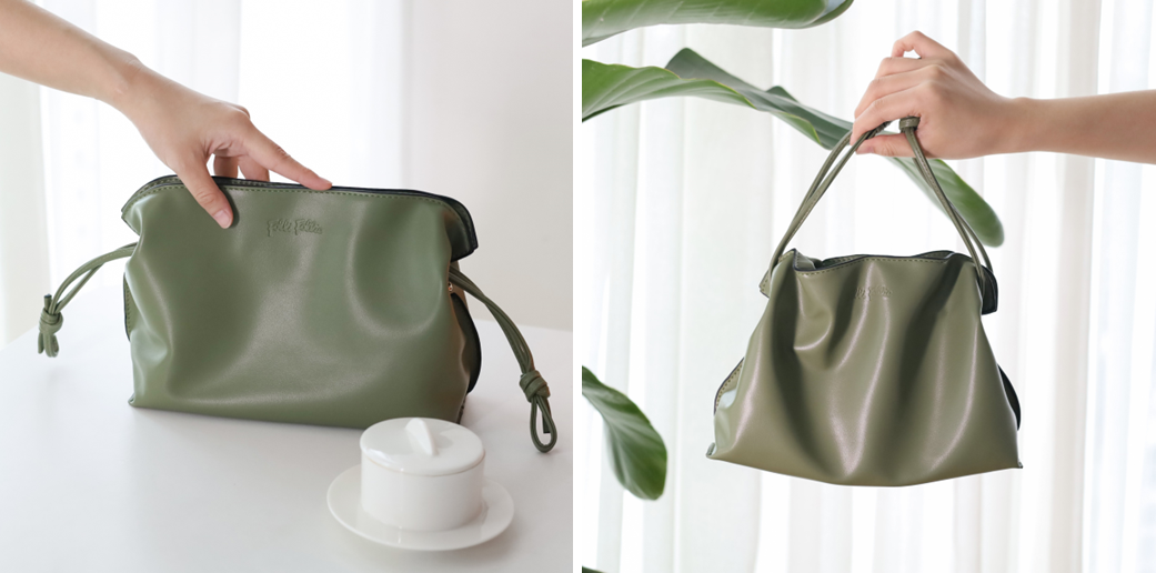 把抽绳拉紧,两边的抽绳还可以手提,当做小拎包或手拿包。