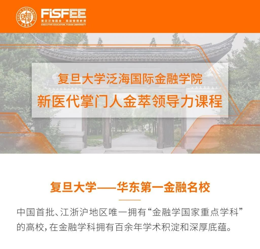 复旦大学泛海国际金融学院最新推出《新医代掌门人金萃领导力课程》,从政策风向解读、医疗新产业研究、资本赋能实践、未来医院建设、管理者思维升级等多个维度提供最前沿的知识,提升中国新一代医疗掌门人的综合领导力。