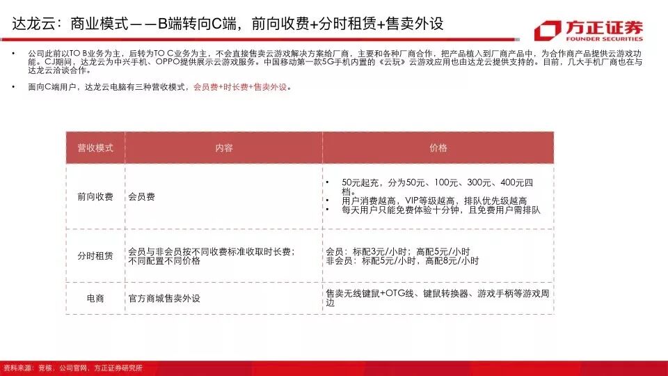 大致上国内云游戏厂商分为两派:PC云游戏、移动云游戏。TO C向的商业模式多采用会员费、时长费、订阅制。面向B端客户,云游厂商还会为其云游戏解决方案,收取技术服务费。