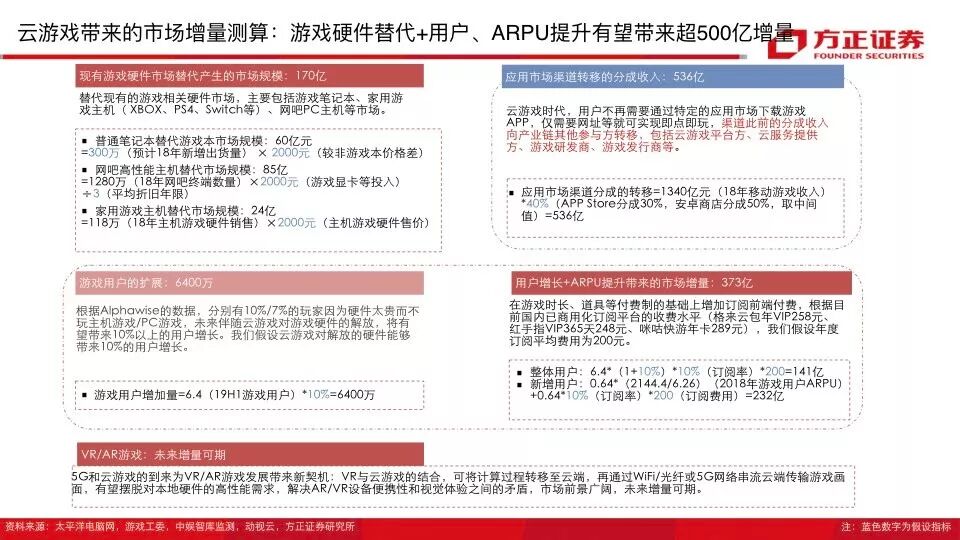 云游戏潜在市场规模将近千亿元:硬件替代+用户增加、ARPU提升+渠道分成收入转移。