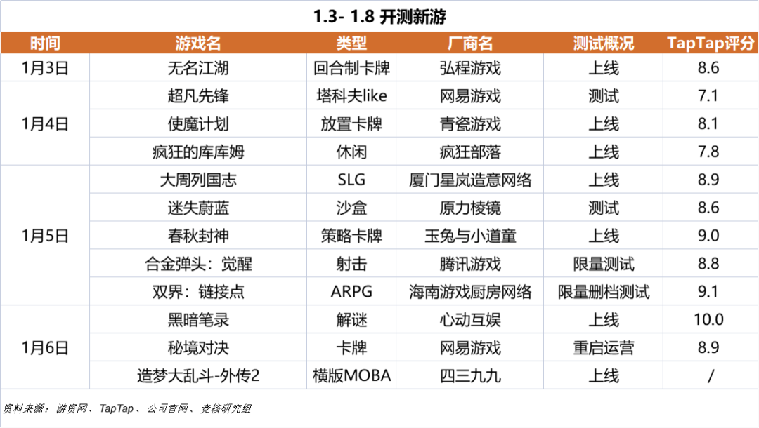 据TapTap统计,下周开测新游中包括腾讯游戏《合金弹头:觉醒》、网易游戏《超凡先锋》、《秘境对决》、青瓷游戏《使魔计划》等。