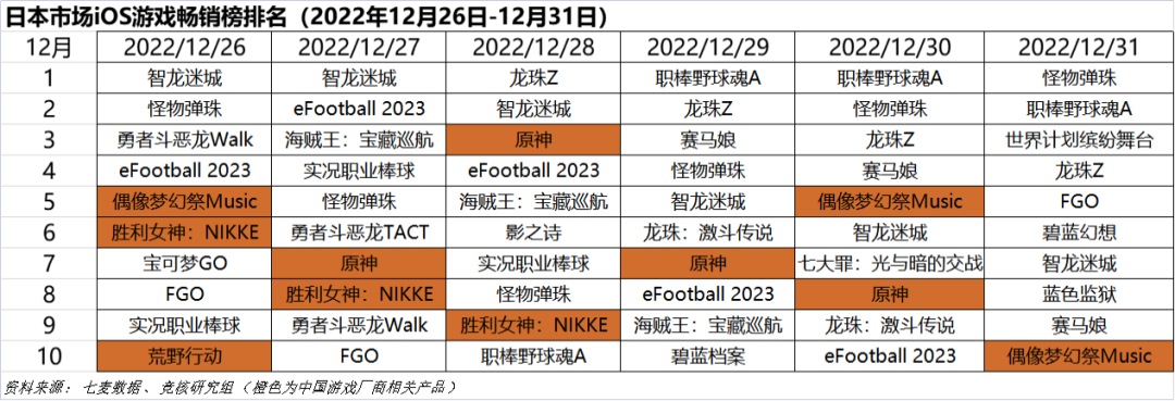 2022年12月26日—12月31日日本iOS游戏类畅销榜中,米哈游《原神》、乐元素《偶像梦幻祭》、腾讯游戏《胜利女神:NIKKE》进入榜单。