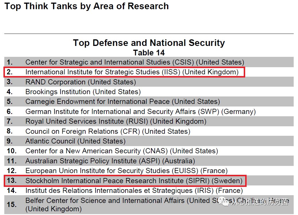 英国国际战略研究所(IISS)和斯德哥尔摩国际和平研究所(SIPRI)这两家智库可不是泛泛之辈,分别名列全球防务与国家安全智库排行榜第2和第13位(《全球智库报告2017》)