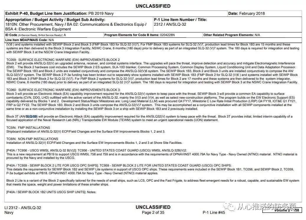 进入新世纪,随着“基建狂魔”——中国在其南海的建岛运动如火如荼,美国海军将不得不更积极地挑战中国的领土要求,两国之间的紧张局势势必升级。基于这一认识,以及中国尖端武器的发展,很可能促使AN/SLQ-59加快部署至印度太平洋地区的美军作战平台上。一些国外的研究人员认为,某些特定武器引发了对该系统的需求。这可能是正确的,但是考虑到我们不清楚它的目的到底是为了对付什么,关于什么样的武器催化了它的部署的猜测仍然只是猜测。这可能是AN/SLQ-32套件无法可靠应对的问题。有人猜测,这一部署是中国反舰弹道导弹能力发展的结果,这也有可能的,但鉴于AN/SLQ-59的安装位置,这似乎不太可能像先进的反舰巡航导弹系统,可能是一个速度极快、相对奇特的系统雷达导引头。其他人则认为这是对朝鲜发展武器装备的回应,但考虑到朝鲜在巡航导弹技术方面的成熟程度,这几乎是不太可能的。事实上,AN/SLQ-59的设计目的可能是为了对抗一些根本不是导弹的事物,比如成群结队的小型无人机——可能会对一艘传感器覆盖的战舰造成严重破坏,或者一大群满载爆炸物的无人艇。美军认为中国正积极地发展这两种武器概念。值得注意的是,AN/SLQ-59附近的机箱和系统肯定具有同时支持多个电子战应用程序的能力。实际上,中国具备在同一个目标上同时对多个威胁进行分层的能力,,或许至少在一定程度上是这些系统部署的目的。无论如何,巡弋在印太地区第七舰队上的电子战装备都需要进行升级,并且最终以“棺材”形状的AN/SLQ-59实现。 仔细寻摸下,AN/SLQ-59系统确实显示在美军的预算文件中。例如,在2019年预算中的AN/SLQ-32订单项下,对AN/SLQ-59的描述如下:Block 3T(AN/SLQ-59)将提供AN/SLQ-32(V)系统所需的电子攻击(EA)能力改进,以跟上威胁的步伐。Block 3T提供了海军研究实验室(NRL)便携式电子战模块(TEWM)系统的重点应用程序的初始、有限过渡功能,可以满足紧急作战需求(UON)。![]()
