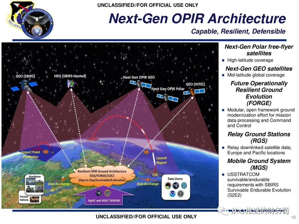 美国太空部队2022财年预算申请关于下一代“过顶持久红外系统”计划部分美国现有天基预警能力的主要支柱是数量相对较少的大型地球静止轨道卫星,称为“天基红外系统” (SBIRS)。“天基红外系统”传感器足够灵敏,可以检测从弹道导弹发射到炮火或飞机在空中爆炸等各种事件。此外,美国空军还运行了“国防支持计划”(DSP)红外预警卫星——它在绕行地球35000公里的地球静止轨道上运行。“天基红外预警系统”(SBIRS)任务概览(翻译 & 字幕 by 防务菌)尽管如此,仍有一些新兴威胁,例如高度机动的高超音速助推滑翔飞行器,现有的 地球静止轨道卫星并非设计用于检测和跟踪这些新兴威胁。根据美国智库国会研究服务处资料显示,美国国防部负责研究和工程的前副部长迈克·格里芬过去曾表示:“高超声速目标比美国通常通过地球静止轨道卫星跟踪的目标隐晦10到20倍。”![]()