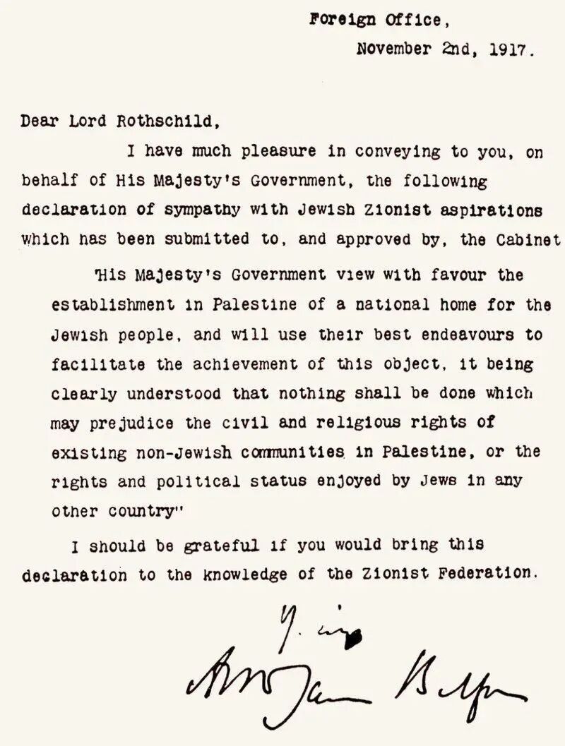 1917年11月2日,英国外交大臣A.J.贝尔福致函英国犹太复国主义者联盟副主席L.W.罗思柴尔德。信中说:“英王陛下政府赞成在巴勒斯坦建立一个犹太人的民族之家,并愿尽最大努力促其实现;但应明确理解,不得做任何事情去损害目前巴勒斯坦非犹太人的公民权利和宗教权利,或者损害其他国家犹太人所享有的权利和政治地位。”