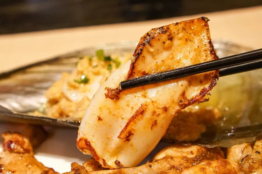 牛蛙上烤架前还被大厨秘制的调料照顾一番,甚至还心机地盖上蛋黄,看个头对比就知道肉也不少还很入味!
