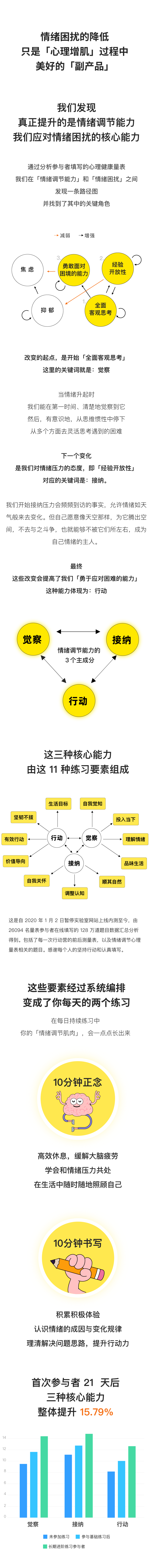 About Feature 一个锻炼情绪调节能力的在线心理健身房,全科班心理学硕博团队创立。科学练习计划+真人陪伴指导,25 天显著改善焦虑抑郁失眠困扰,提升幸福感。