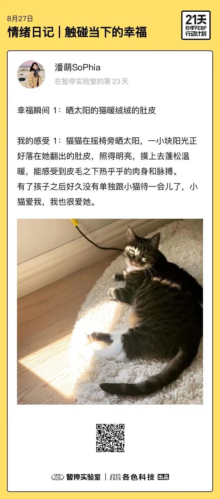 就在这时,我从好友邦妮的播客知道了暂停实验室的【情绪减压21天计划- 正念书写行动营】,简单research了一下,几位团队主创都是科班心理学出身的青年科学家,每日安排是 20 分钟左右(这是像我一样的新手妈妈所能挤出来的极限了),正好是截止日当天,充满好奇地交钱报了名。