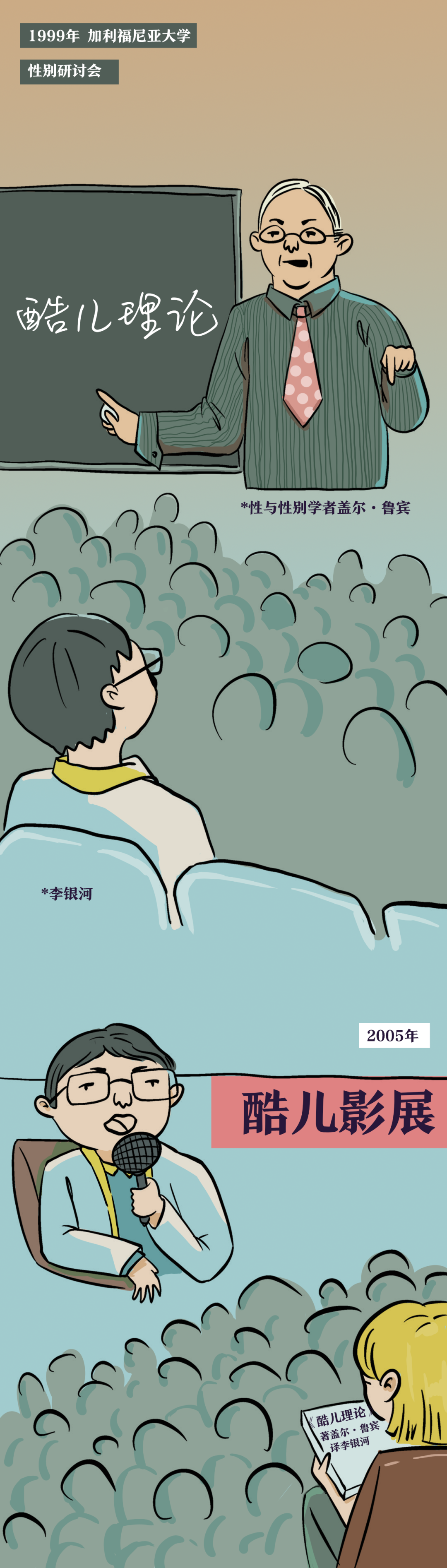 1999年,加利福尼亚大学的性别研讨会上,李银河听取了性/别学者盖尔·鲁宾的讲座。次年,她翻译了由鲁宾领衔的一众酷儿理论家的重要理论作品。这本《酷儿理论》(2000),是「酷儿」一词最早被引入中国大陆的重要契机……
