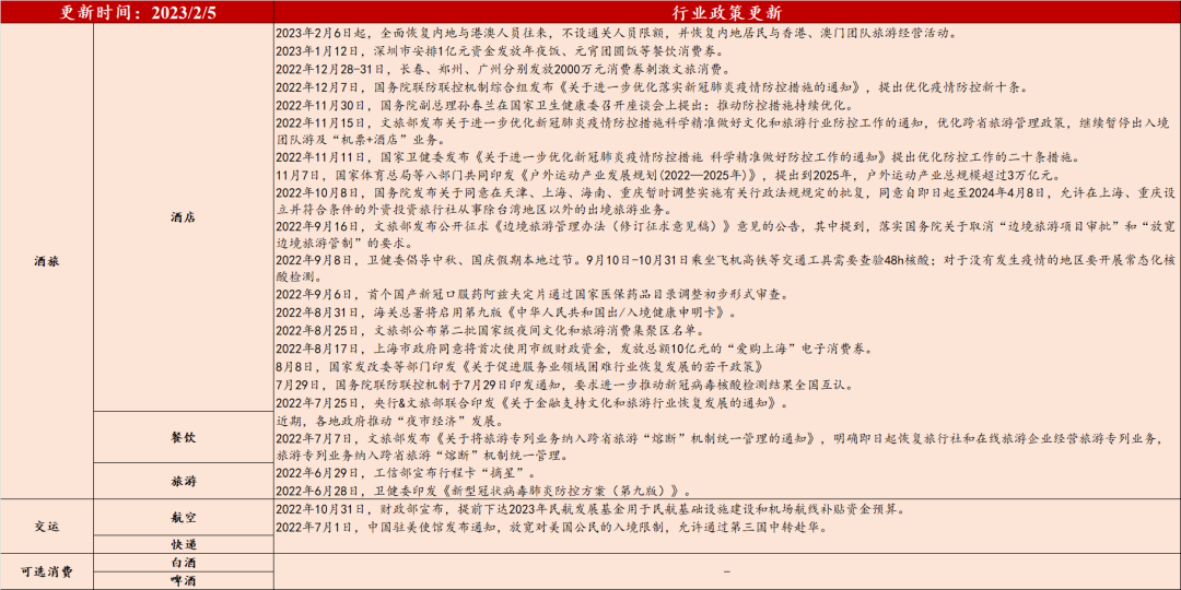 1) 汽车:1月销量预期走弱,支持政策有望陆续出台。a、1月销量预测:乘联会预测,1月狭义乘用车零售销量预计136.0万辆,同比-34.6%,环比-37.3%。b、政策:1、2023年2月2日,商务部:2023年降聚焦汽车、家居重点消费推出一批新政策。2、2023年1月28日,国常会:促进汽车等大宗消费政策落地。3、年初以来,包括山东、沈阳、郑州、深圳、南京、三亚等多省市陆续发放汽车消费券以提升购车需求,弥补补贴到期对需求的负面影响。