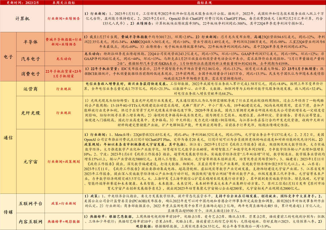 1) 计算机:根据民生计算机团队分析,a、国企改革方面,中国电科与中国电子的历史背景和战略定位决定了其计算机行业“国家队”的重大使命,在专业化整合等政策驱动下有望迎来深化改革的重要红利,建议重点关注两大集团旗下的上市公司。b、ChatGPT方面,从技术到使用,商业化空间逐步打开激发更大潜力,建议关注NLP技术深度布局企业,以及使用ChatGTP带来业务逻辑质变重估潜力的企业。