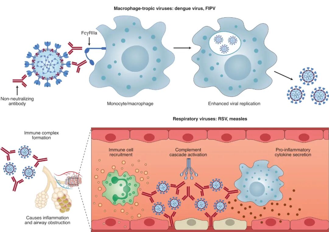 在SARS-CoV非典、MERS-CoV中东呼吸综合征和其他人类呼吸道病毒感染(包括RSV和麻疹)研究中都能观察到ADE效应。