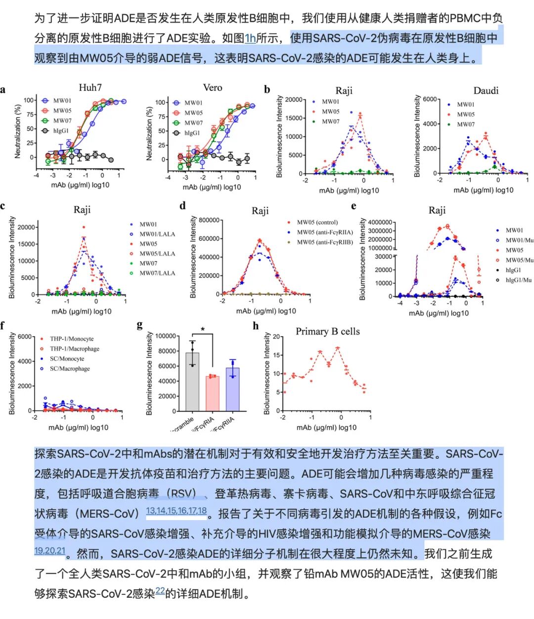 实验研究使用SARS-CoV-2伪病毒(新冠灭活病毒)在原发性B细胞中观察到由MW05介导的弱ADE信号,这表明SARS-CoV-2感染的ADE可能发生在人类身上。