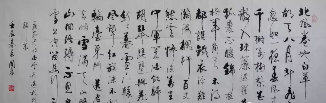 中间四句为第二部分,描绘白天雪景的雄伟壮阔和饯别宴会的盛况。“瀚海阑干百丈冰,愁云惨淡万里凝”,用浪漫夸张的手法,描绘雪中天地的整体形象,反衬下文的欢乐场面,体现将士们歌舞的积极意义。"中军置酒饮归客,胡琴琵琶与羌笛",笔墨不多,却表现了送别的热烈与隆重。在主帅的中军摆开筵席,倾其所有地搬来各种乐器,且歌且舞,开怀畅饮,这宴会一直持续到暮色来临。第一部分内在的热情,在这里迸发倾泄出来,达到了欢乐的顶点。