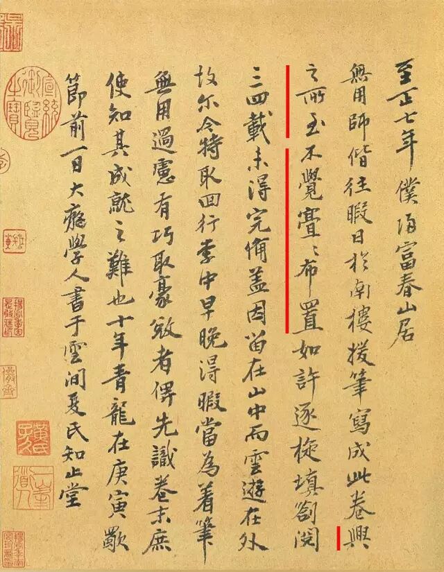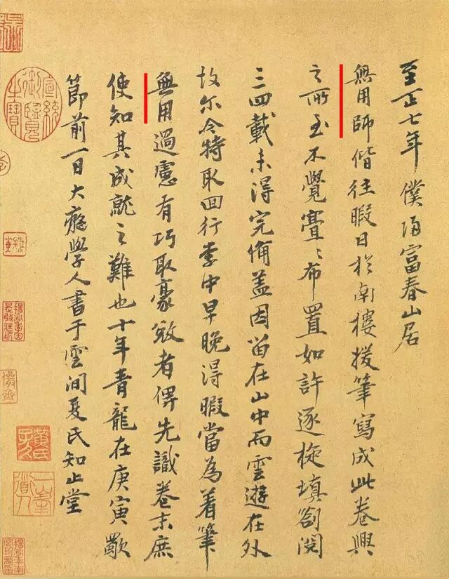 “至正七年 仆归富春山居 无用师偕往 暇日于南楼援笔写成此卷 兴之所至 不觉亹亹布置如许逐旋填剳阅三四载未得完备盖因留在山中而云游在外 故尔 今特取回行李中 早晚得暇当为著笔 无用过虑 有巧取豪夺者俾先设卷末庶使知其成就之难也十年青龙在庚寅歜节前一日 大痴学人书于云间 夏氏知止堂”