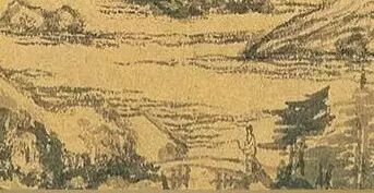 我们这里又看到一个人,这是我跟大家提到大概最容易找到的三个人物,可是这个人姿态动作形象都跟刚才那个非常相像,所以是刚才那个人到这里来了吗?如果是刚才那个人到了这里,那意思说他不是两个人,他是同一个人在不同的时间,不同的时间你会在不同的位置。这样可以了解,因为它是长卷,长卷不是摄影,长卷是电影,它里面用了很多蒙太奇的方法去剪接了。时间里面不断的连续,有时候可能是倒叙,有时候可能是对未来的幻想,所以这些东西在交错。所以1895年有了电影之后,其实用它来理解东方的长卷是更好的方法,因为西方的画画,一定站在那边,闭起一个眼睛这样比来比去,因为他在找焦点。你从来没有看到张大千需要这样画画,因为他就是坐在船上,玩了一玩以后,回来靠记忆画画,他不是在找焦点。如果焦点,那个叫焦点透视,没有办法真正扩远。黄公望一直讲扩远,是要宽阔出去的远,那个要散点透视,他必须放大出去,所以他只有电影能够解释,这样的一种空间形态。这个人物比刚才那个还要精简,简单的几笔线就完全勾出来。所以我觉得好可惜,乾隆其实上一上别的课的话,会知道这个笔力不苶弱,因为很厉害,因为笔这么精简的时候是最困难的事情。