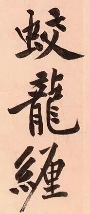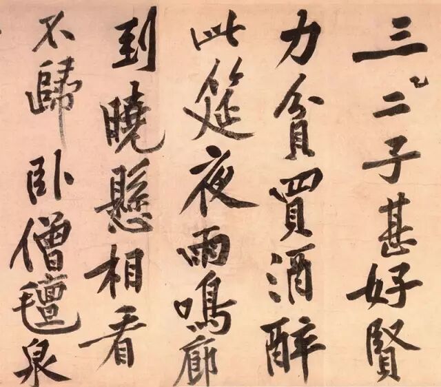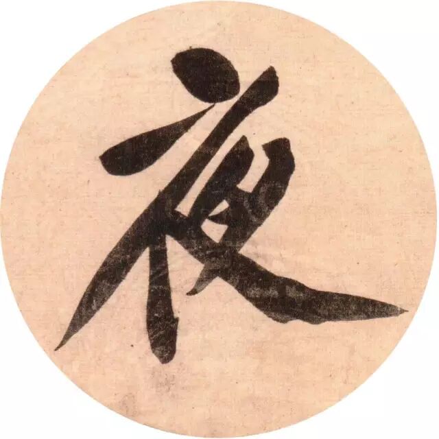 我们看到“夜”这个字,一横的部分变成挑上去,接下来这一撇很漂亮,拉了一个长线条过来,所以这个字就被分割成两部分,变成一个斜的切角线,有点像一个菱形的感觉。而最后的这一笔捺划是很快速的拉出去的,所以又是一个潇洒的线,两根潇洒的线连接在一起构成一个像金字塔的结构,所以“夜”字是极其漂亮的。黄庭坚用了很多的长线条使他的字有一种向八面出锋的感觉,一种放射性的感觉,那个时候字就变得很潇洒,而不是被压缩的感觉、不是被约束的感觉。