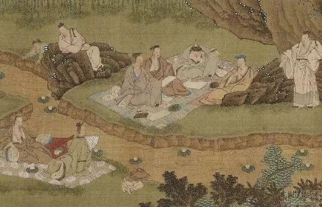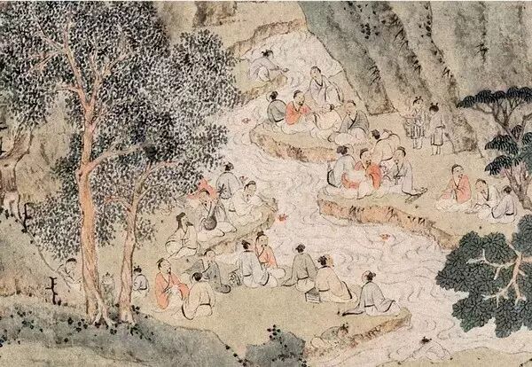 大家散坐在蜿蜒曲折的溪水两旁,然后由书僮将斟酒的羽觞放入澄澈的溪中,让其顺流而下,若觞在谁的面前停滞了,谁得赋诗,若吟不出诗,则要罚酒三杯。