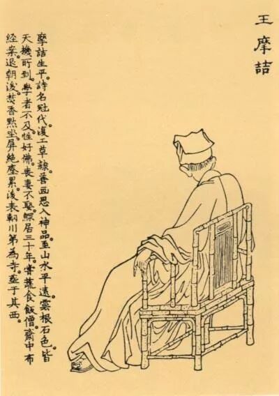 大约在王维30岁时,他的妻子去世。王维从此孤居三十年,不再娶,且禁肉食,绝彩衣。房间中除了茶档、茶臼、经案、绳床,此外一无所有。
