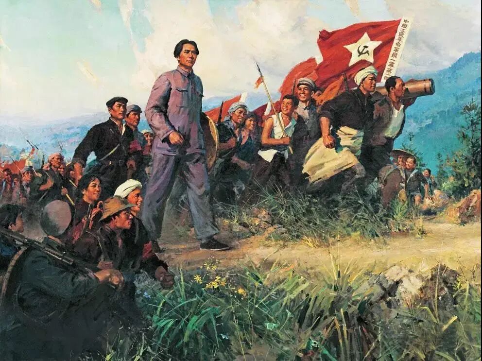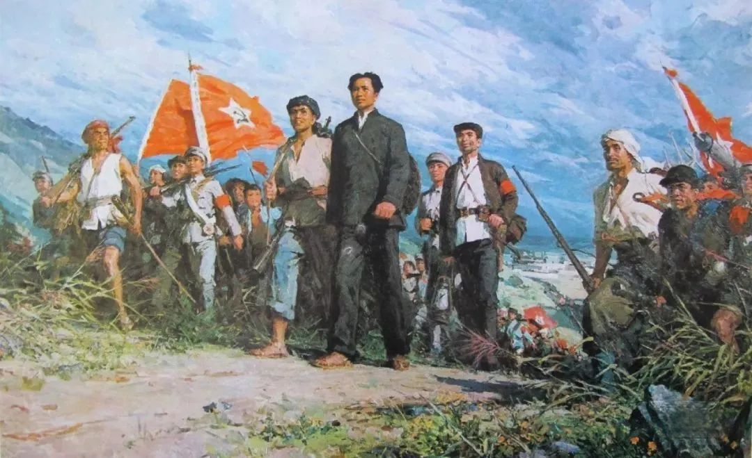 第二层:“匡庐一带不停留,要向潇湘直进”,这两句点明行军方向,语气急促而斩截明快。“不停留”与“直进”连用,渲染出行军者昂扬的斗志、急迫的心情、加速的步伐和时不我待、日夜兼程的紧张气氛。读者似能看见一队队手持梭镖、身背大刀、肩扛土铳洋枪的革命军战士们行进在湘赣交界处的崇山峻岭、田间水边,白天红旗引路,夜晚火把照明……似能听到嘹亮的军号声,急促的马蹄声和不停的脚步声。由于工农革命军由赣入湘,目的是会合平江、浏阳的起义农民,协同攻打长沙,于是下片词的表现空间,也由上片的“匡庐一带”转入“潇湘”亦即湖南境内。