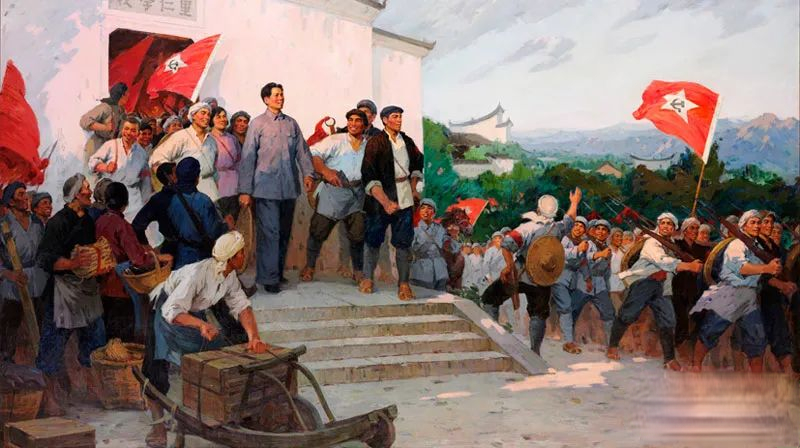 第二层:“秋收时节暮云愁,霹雳一声暴动。”写出了起义的时间和声势。“秋收时节”,交代了季节,含有9月9日重阳节之意。“暮云愁”写出了“黑云压城城欲摧”的氛围。用一个“愁”字作谓语,加以拟人化,突现了氛围的凝重、激越和悲壮。饱受痛苦的农民和工人实在忍受不住了,怀着数千年做牛做马的旧恨和对蒋介石、汪精卫大屠杀的新仇,必然产生“霹雳一声暴动”的结果。“霹雳一声”承“暮云愁”而来,黑密的阴云,饱含着雨滴,必然要产生巨大的雷鸣,这就是暴风雨的前奏曲。