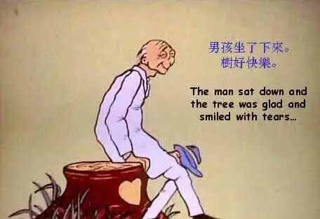 有一个小男孩,他从小就在一棵大树旁边玩。大树长得很高,硕果累累,是一颗大苹果树,又漂亮,又有很多甜美的果子。这孩子就天天围着树,有时候爬到树上摘果子吃,有时候在树下睡觉,有时候捡树叶,有时候他也拿着刀片、瓦片什么的在树上乱刻乱划。大树特别爱这个孩子,从来也不埋怨他,就天天陪着他玩。